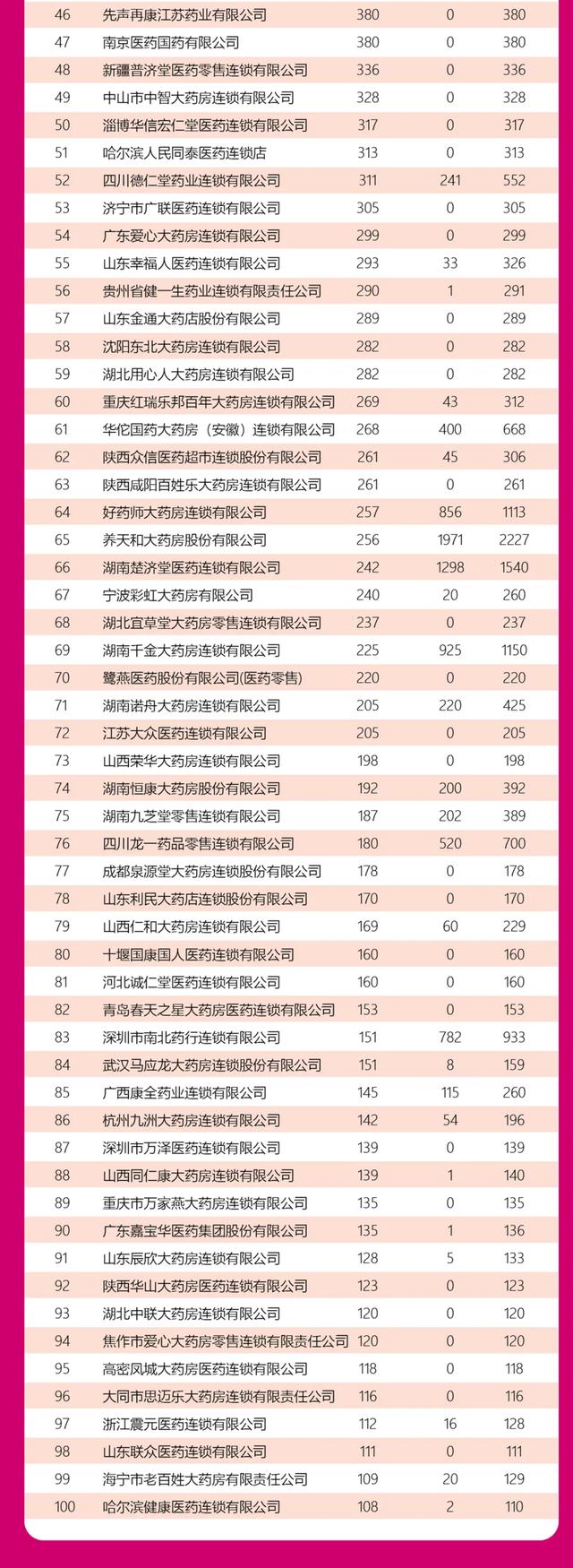 直营药店百强名单公布:唐艺昕直营店6266家,排名第一;大参林直营店4702家,排名第二。...