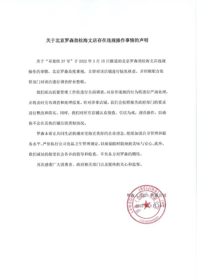 15日晚,“京津冀罗森”微信官方账号发布声明称,罗森对此高度重视,立即核查店铺情况,并积极配合监管部门调查,停业整顿。