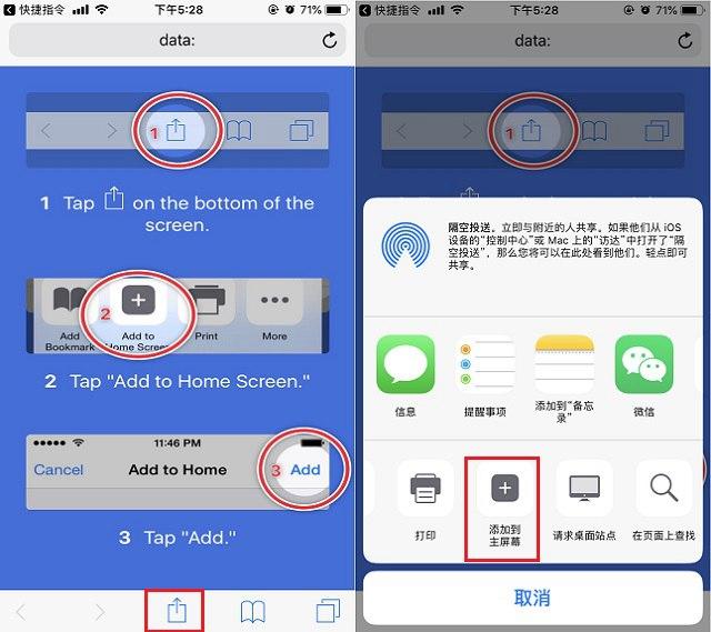 6.接下来会进入数据图标设置页面,主要是给桌面添加图标。很好操作。单击底部中间的共享图标。在弹出的底部菜单中,找到并点击“添加到主屏幕”进入下一步,如下图所示。如果您没有看到“添加到主屏幕”,请向左滑动底部图标行,您可以看到它。
