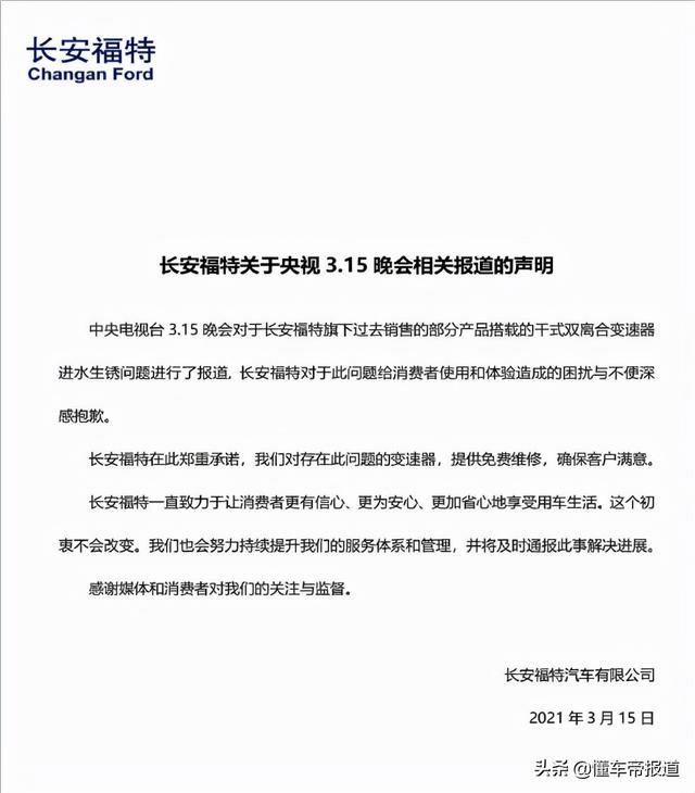 曝光后,长安福特发来消息回应,为存在此问题的变速器提供免费维修,确保客户满意,并及时汇报解决此事的进展。