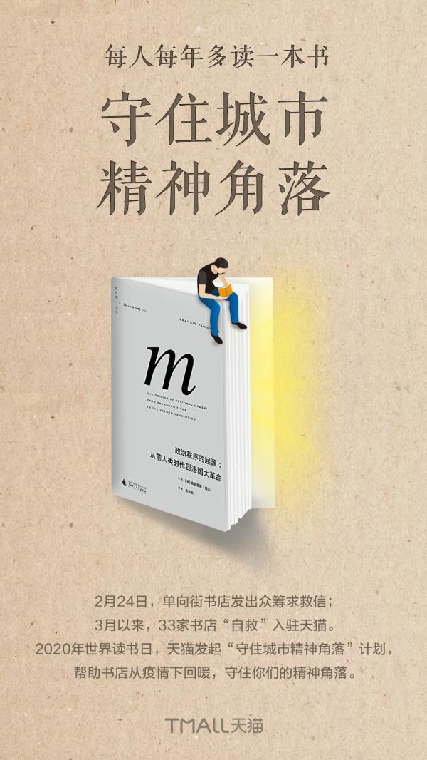 “为了读者,守好书店!”4月23日世界读书日,天猫推出“守住城市精神角落”计划,帮助书店迎难而上:入驻天猫要求更低,流程更简单,开通“光店”专属频道,入驻即可开通淘宝直播,直播技能培训,书业直播资源支持,天猫旗舰店运营课程培训等。