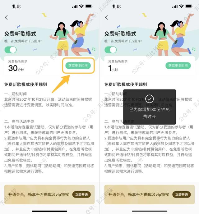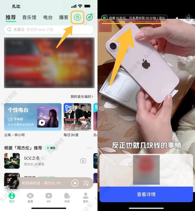 如果你是测试用户,QQ音乐首页右上角会有一个“免费”图标,点击后会自动播放广告。播放15秒广告,免费听歌30分钟。碰巧的是,Zabi是一个幸运的测试用户。