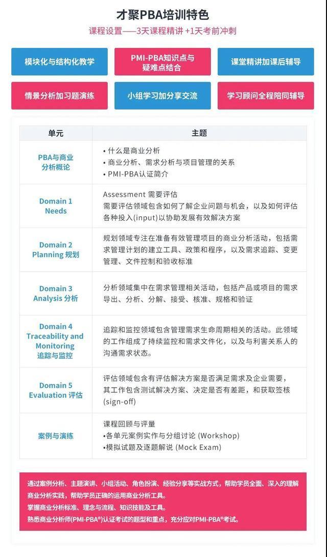 本课程是针对PMI-PBA认证内容设计的,为已经拥有PMP认证或有一定基础的项目经理量身定制,加强他们的业务分析和需求分析能力。通过课程设计的情景讨论以及丰富的实践经验和案例分享,参与者不仅可以有效吸收经营分析领域的专业知识和技能,还可以将其运用到工作中,从而大大提高项目或产品的成功率。
