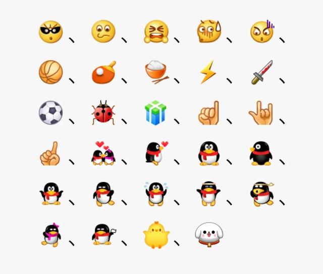 【酷】、【饿】、【疯】、【尴尬】、【惊恐】、【篮球】、【乒乓球】、【饭】、【闪电】、【刀】、【足球】、【瓢虫】、【礼物】、【坏】、【爱你