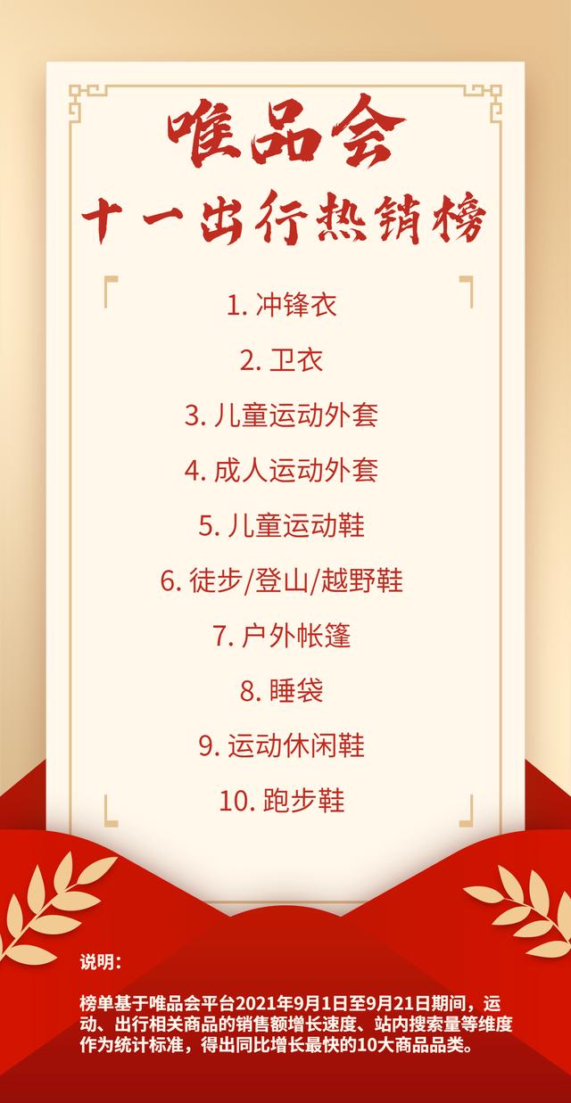 国庆黄金周临近,唯品会发布“十一旅游热门榜”。夹克、毛衣和运动夹克等必备旅行用品在清单中排名靠前。户外帐篷和睡袋也在节前热销产品的TOP10上。