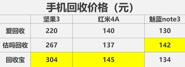 为了给这三款手机一个更好的价格,我对比了同一款手机在这三个回收平台的回收价格。坚果3的价格在回收宝最高,为304元。魅蓝note3预计回收价略高,为142元,剩余的红米4A将交由爱回收处理。通过简单的对比,我们发现爱回收最出名,但是回收价格比其他两个平台都低。