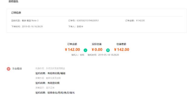 爱回收和回收宝当面确认后可以及时付款。整个过程估计回收要多两天因为只能快递。这里需要补充的是,从预计采集时间到测试结束需要9个小时。付款后给我出具了一份质检报告,上面显示有三项不合格: