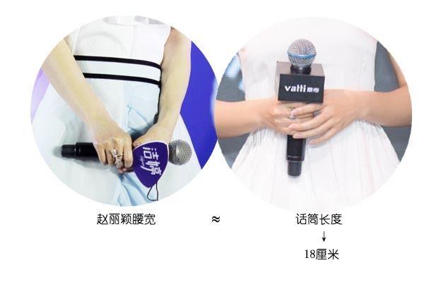 一个话筒的长度大概是18厘米,颖宝的腰几乎和话筒一样宽。这样,颖宝的腰围只有56 cm左右,不到1尺7。天生骨架小的颖宝,可以说是当之无愧的“小蛮腰精”。