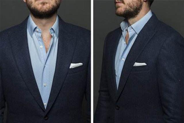 注意你喉结的位置。穿上衬衫后,领子的高度刚好在喉结以下两指左右。这是一条可以修饰颈线的金线。如果领子位置太高,会显得你的脖子又粗又短,也就是我们通常所说的“无颈”。