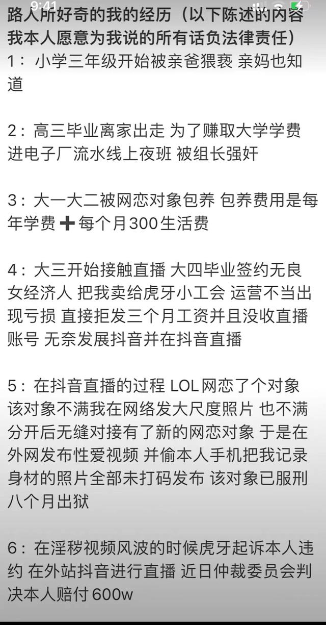 根据他在微博中发布的说明,她承认由于童年的影响,自己的三观出现了一些问题,但这不是她想要的,而是生活所迫。从小学三年级开始,她就被自己的亲生父亲猥亵,母亲知道情况,却没有制止,很难想象她的童年是如何度过的。