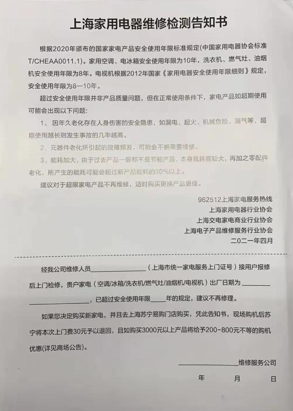 届时,行业协会所属的300多家维修企业和持有上海市统一的《家电维修服务证》的近5000名人员将带着这份《通知》上门。维修时,当发现待修家电同时满足两个条件,一个是已超限额使用,一个是已无维修价值,或者维修费用很高时,会向用户发出通知,用户可自行决定是否继续维修。
