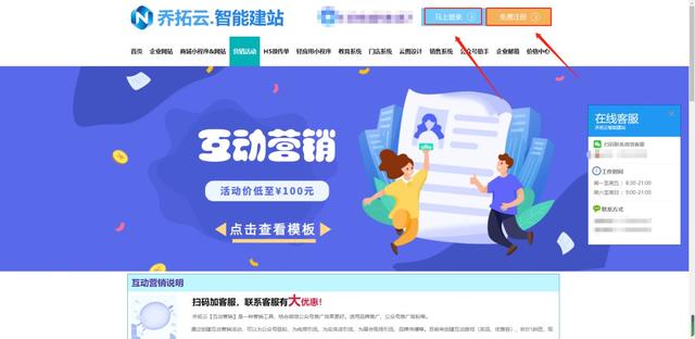 1.首先我们可以搜索浏览器找到乔托云的官网。我们可以选择直接登录或者注册一个账号再登录后台,如图中红色箭头所示。