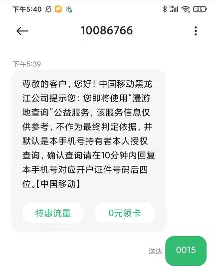 将短信CXMYD# ID号的后四位编辑为10001,授权回复Y后,实现“漫游地查询& # 34;,可以查看该手机号码过去15天的信息。