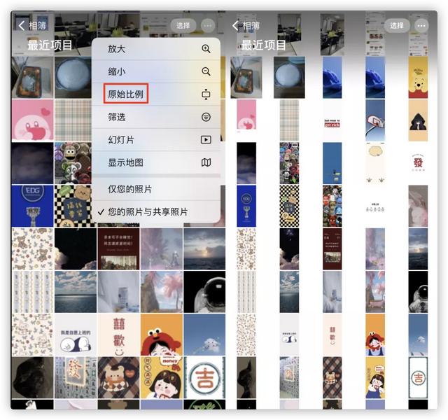 我们只要进入相册,点击右上角的“…”,选择“原图比例”,壁纸就可以显示全图了。