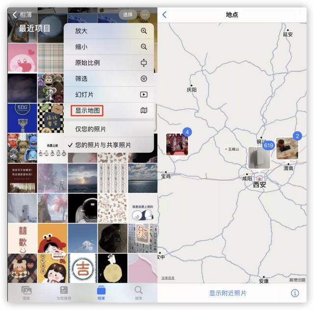 如图,我们进入照片App,打开相册,点击右上角的“…”,然后选择“显示地图”。