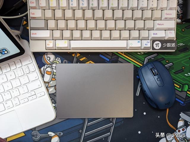 鼠标、键盘和内容的共享在我们的测试中,共享的鼠标和键盘似乎没有受到限制——只要连接到这两个设备,就可以用来控制。我们使用了一台11英寸的iPad Pro(第三代)(俗称iPad Pro M1)和一台Mac mini(2020,M1),前者配有iPad Pro的智能键盘,后者配有HHKB键盘、Magic Trackpad和罗技MX Anywhere 2s鼠标,用于测试。测试中,两种键盘都能在iPad和Mac上输入内容(本文是用iPad的奇妙键盘在Mac上打出的);同时,iPad智能控制键盘的内置触摸板也可以控制Mac上的鼠标;连接到Mac的触摸板和鼠标也可以用来控制iPad。