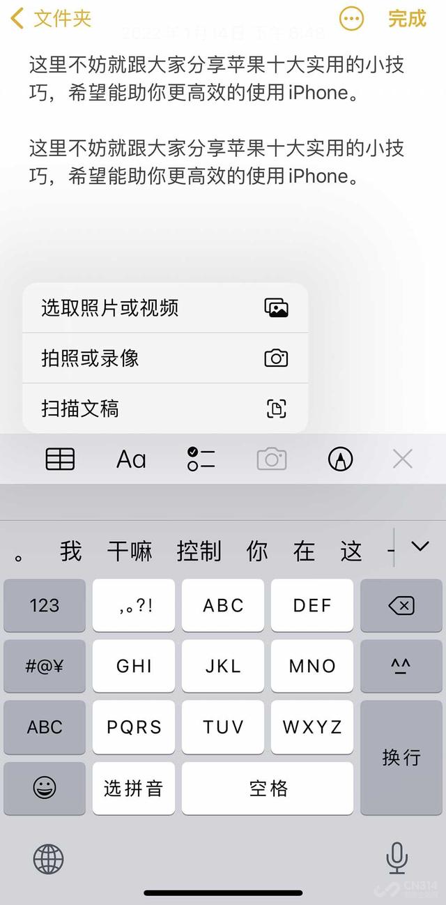 很多时候纸质文件不方便携带,需要拍照,但是效果不是很好。这时,我们可以使用备忘录中的扫描文档。点击“+”按钮,选择“扫描文档”,拍摄完成后点击“完成”,扫描的文档会出现在备忘录中,比拍摄的照片更清晰。并且文字可以复制粘贴,纸质文档可以转换成电子文件。