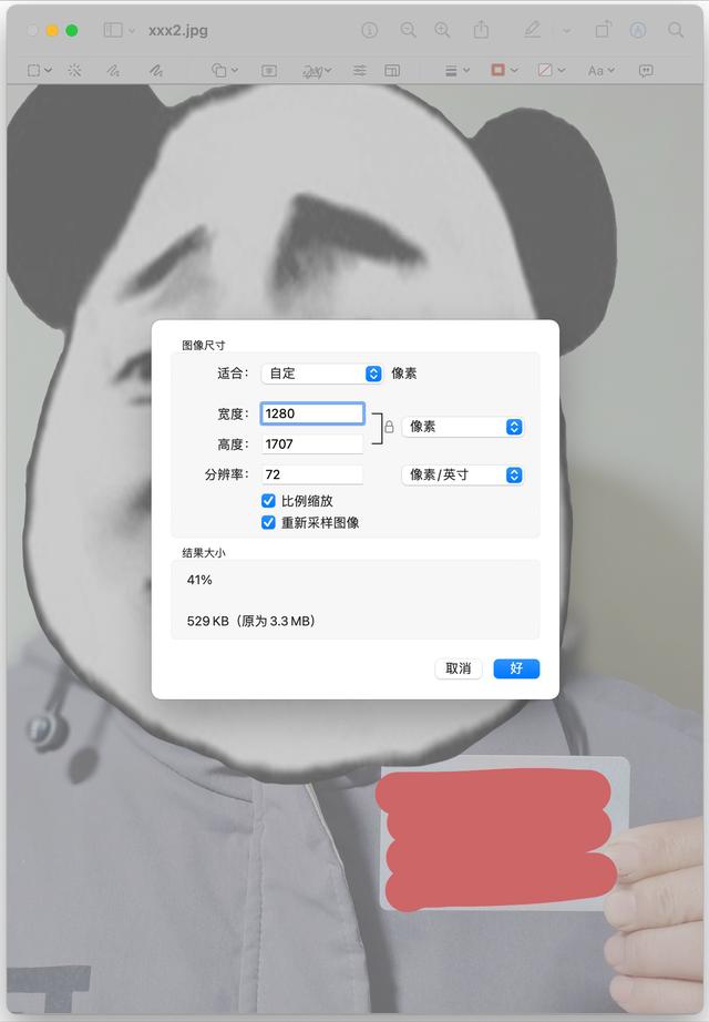 在这个例子中,边肖使用的照片的原始分辨率为3120*4160,大小为10.4米。使用MacOS的预览功能来修改图片大小。图片分辨率改为1280*1707后,图片尺寸为603k。