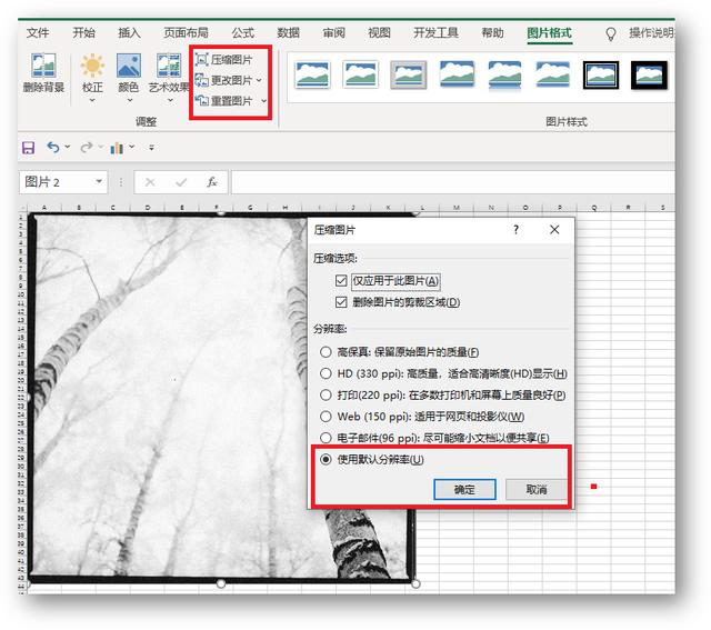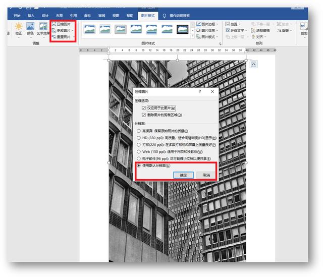 Word不仅可以写文字,还可以压缩图片。压缩效率相当高,压缩方法非常简单。将图片添加到Word文档中,选择图片,在[图片格式]下选择[压缩图片]-[使用默认分辨率],然后单击[确定]。