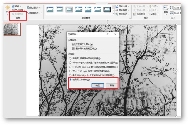PPT的压缩方式和Word一样。添加图片,选择图片并单击[压缩图片]-[使用默认分辨率]-[确定]。