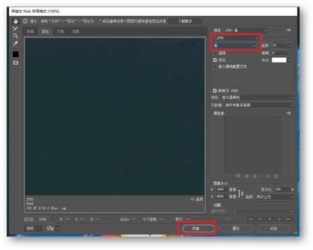 然后会弹出一个Web格式转换框,选择【JPEG】- Low,点击保存选择好路径。