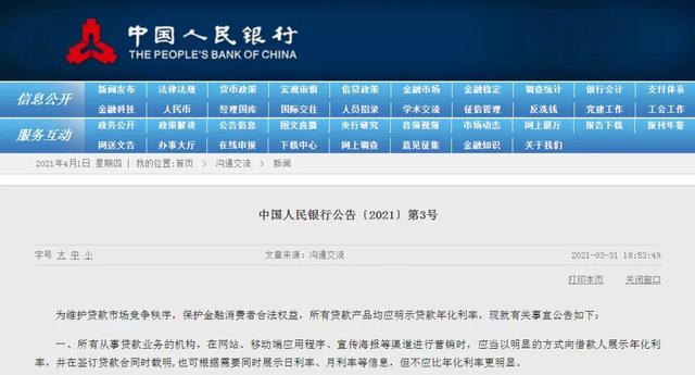 3月31日,央行发布今年第3号公告,指出所有从事贷款业务的机构(包括但不限于存款类金融机构、汽车金融公司、消费金融公司、小额贷款公司以及为贷款业务提供广告或展示平台的互联网平台等。)在通过网站、手机应用、海报等渠道进行营销时,应当以明显的方式向借款人展示年化利率,并在签订借款合同时予以载明。日利率、月利率等信息也可以根据需要同时显示,但不能比年化利率更明显。