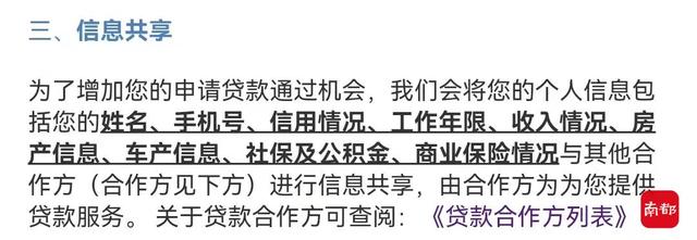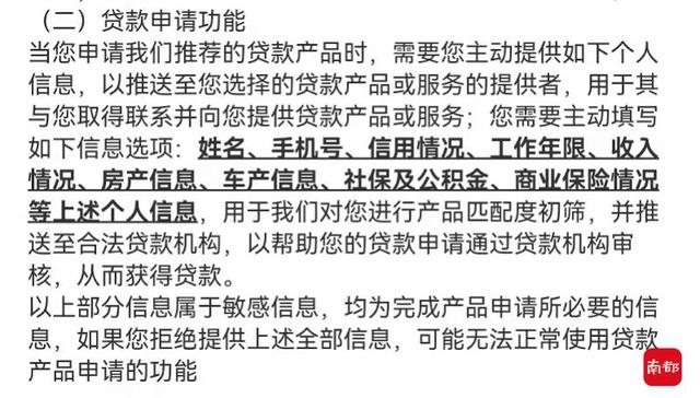 杜南记者继续浏览协议发现,如果要使用贷款申请功能,用户需要主动填写姓名、手机号、信用状况、收入状况、房产信息、汽车生产信息、社保和公积金、商业保险等个人信息。同时,协议还提到,上述信息将与其他合作伙伴共享。