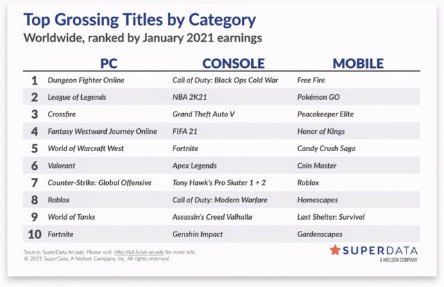 不过这种老游戏一直都很赚钱。2021年1月,我们仍然可以看到它在全球游戏收入排行榜上排名第九。事实上,在之前的几年里,《坦克世界》多次出现在各数据机构公布的PC游戏收入排行榜前10名中。