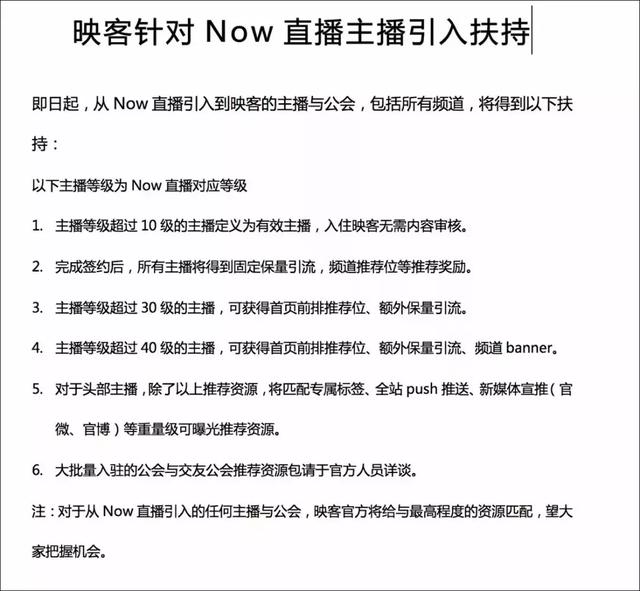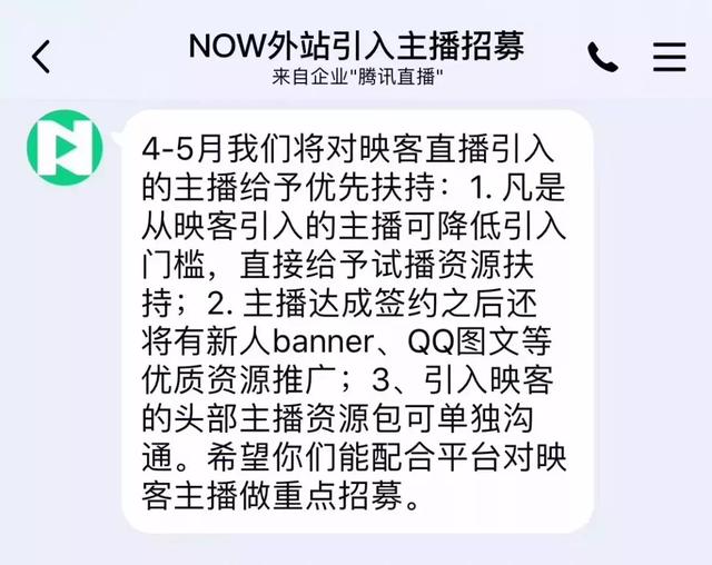 而另一张是疑似NOW直播的招聘截图。截图显示,4-5月从映客直播引进的主播,会得到NOW平台的优先扶持:降低介绍门槛,签约后提供banner、QQ图片等优质资源供新人推广;对于映客的头部主播,可以单独与NOW平台沟通,定制头部主播资源包。