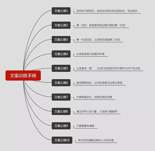 一个文案要想写好,把产品卖出去,可以借鉴《文案培训手册》中提出的文案十大公理,如图: