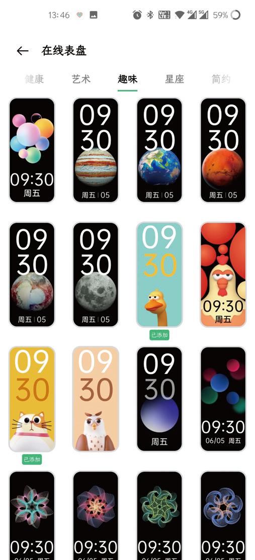 ▲线上表盘有160多种款式,还在不断增加,涵盖健康、艺术、趣味、星座、简约等类别。
