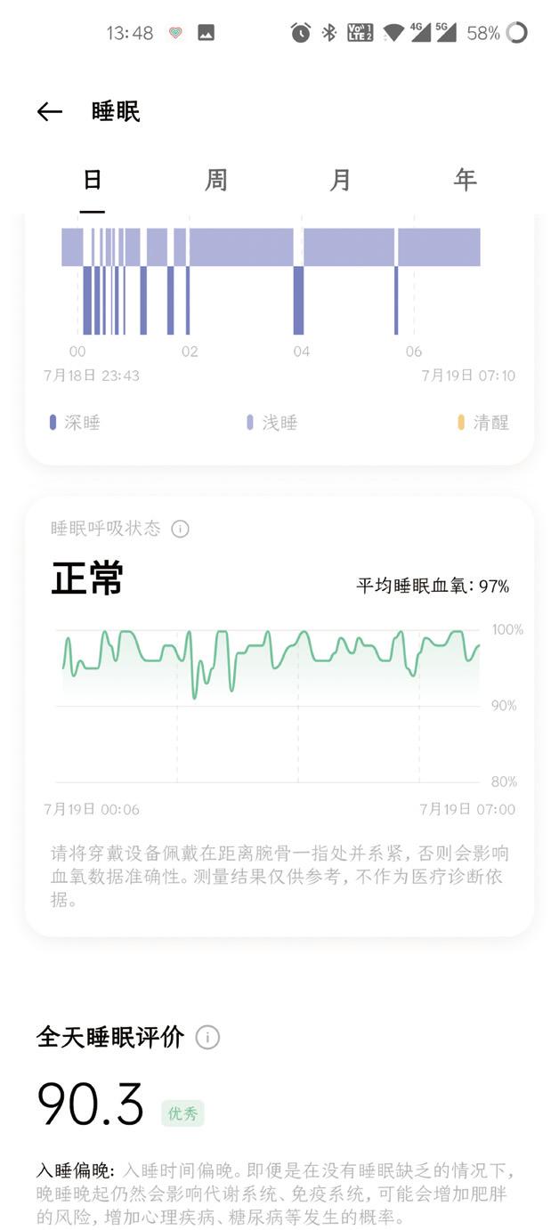 我们知道,目前一些智能手环只能单点监测血氧。如果要监测一段时间的血氧饱和度,就需要持续的血氧监测。OPPO智能手环活力版还支持睡眠血氧监测,从而评估呼吸质量。它的睡眠监测准确率比较高,睡眠时间和清醒时间与实际情况几乎一致。同时会根据睡眠数据进行分析并给出建议。