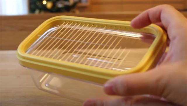 你可以看到中间的切割网很薄。一般日本家庭主妇会用它切黄油和奶酪,不会粘刀。当然,你也可以用它来切一些又软又粘的食物,甚至是煮鸡蛋!