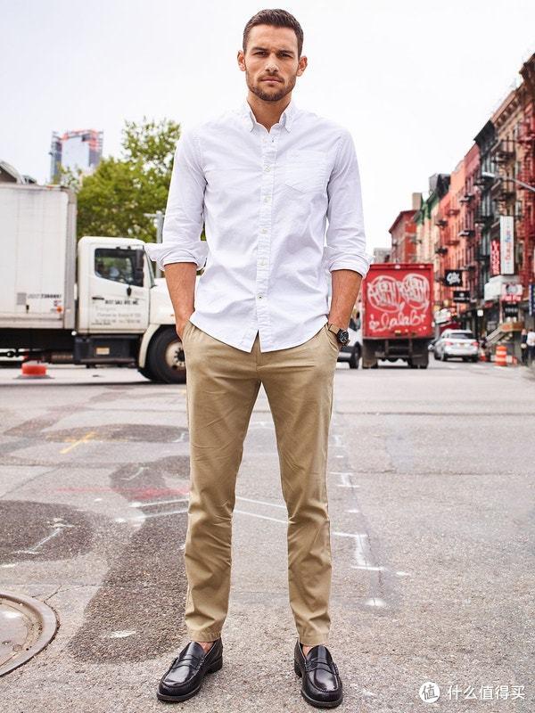 经典卡其色搭配白衬衫和皮鞋也很好看。