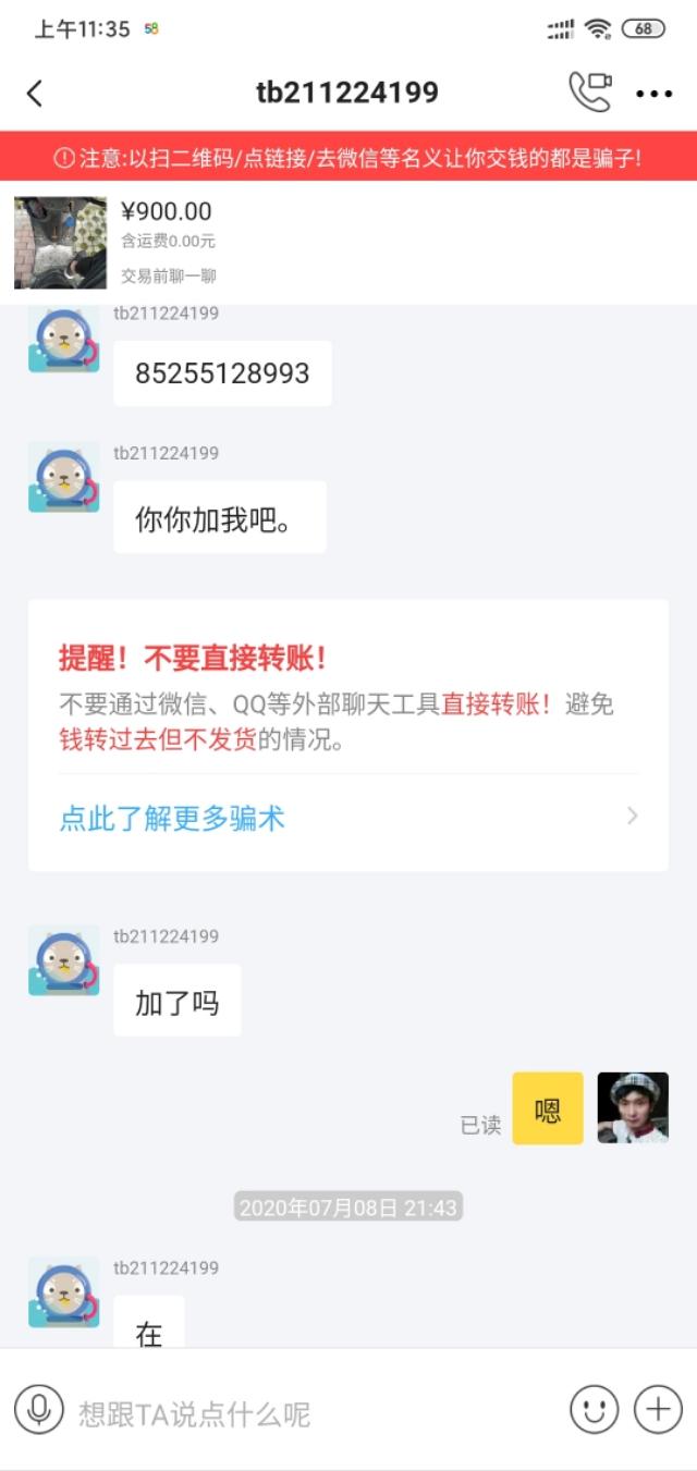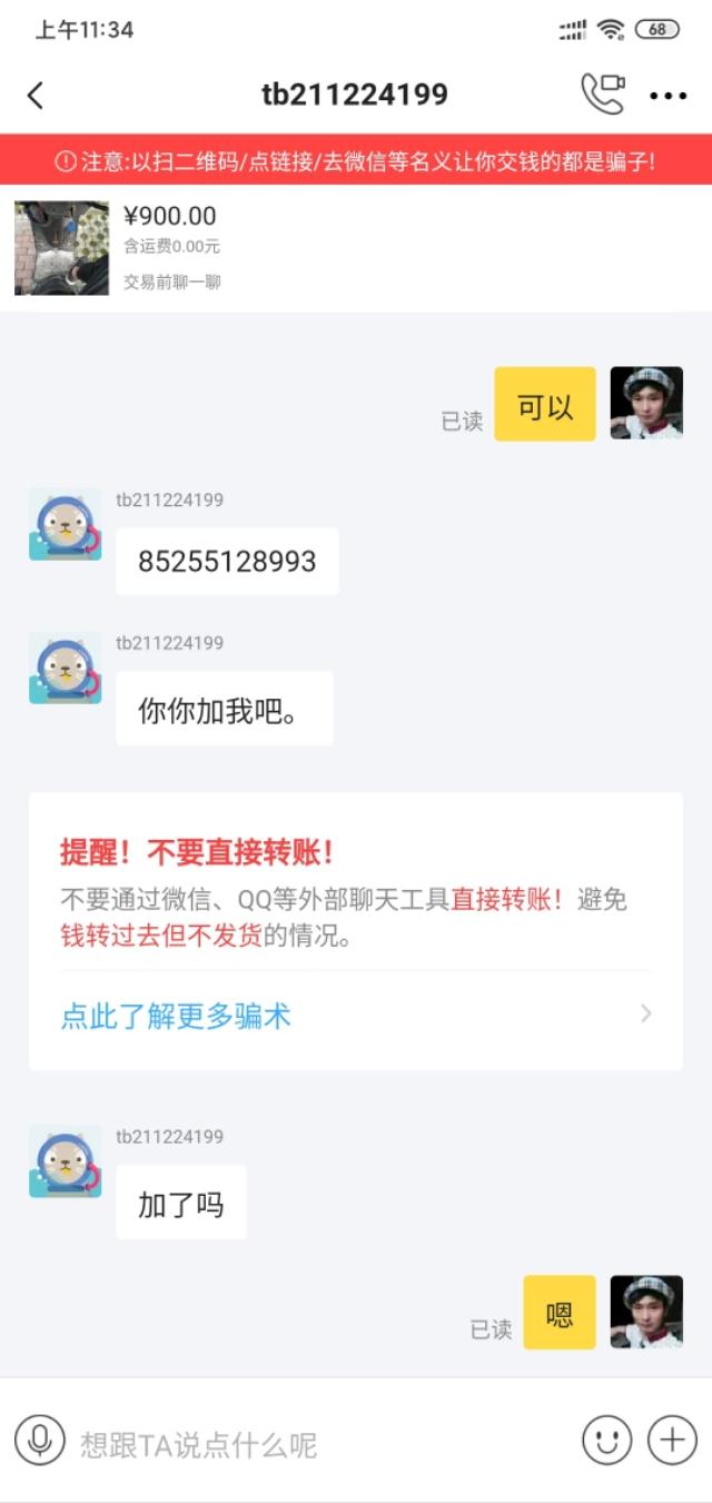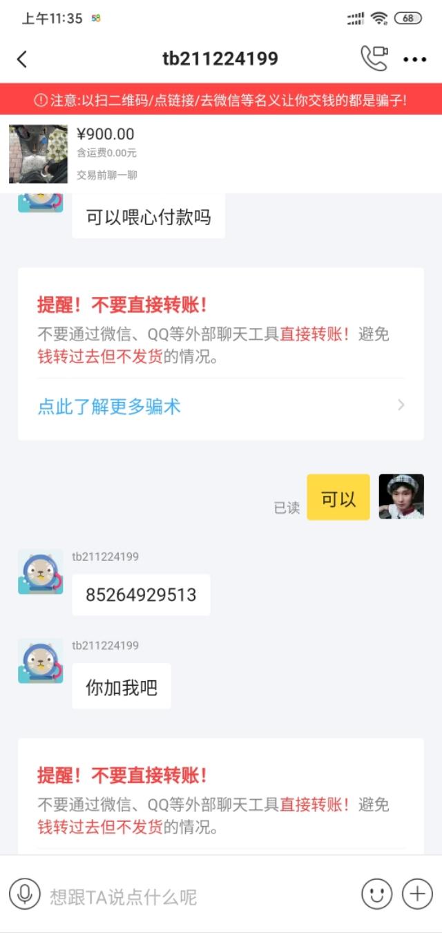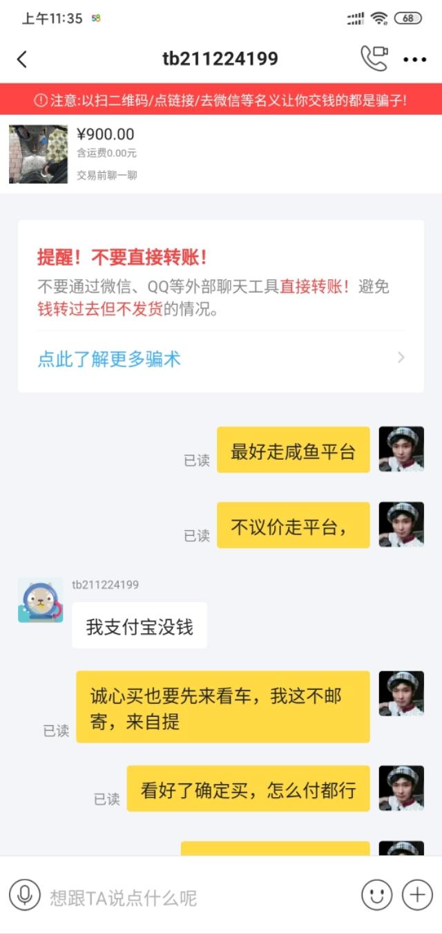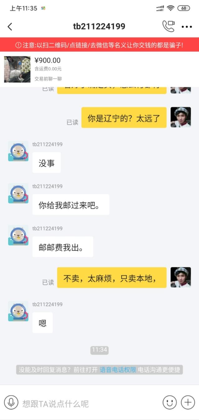我有一辆不能用的滑板车,准备挂在闲鱼上卖。注意了,只限本地自提。很多人来求教。其中一个后来说他会用vx支付。我以为是本地的,就答应了。我可以自筹支付。他把vx号码发给我问我。我加了之后,没有跟他打招呼。后来他让我加在闲鱼上。我觉得不对,就看着我加了。再看看他的闲鱼号,连芝麻信用都没有授权,感觉可能遇到骗子了。后来我最后一次在闲鱼给他打电话,只能在本地提一下。他回复说他的邮费是让我给他寄的。现在我觉得肯定遇到骗子了,就直接告诉他我不在外地卖,结束了和他的聊天。今天就和大家分享一下,让大家不要上当受骗。买卖双方都要注意不要离开平台去其他地方交易。现在,有各种各样的骗子。