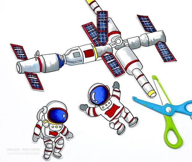 通过观察和欣赏图片和视频,航天员的服装有什么特点?天宫十二号飞船长什么样?用来描述飞船和宇航员在Tai 空中漫步,巧妙地用草稿纸来表现画面的背景,创造出生动有趣的画面。