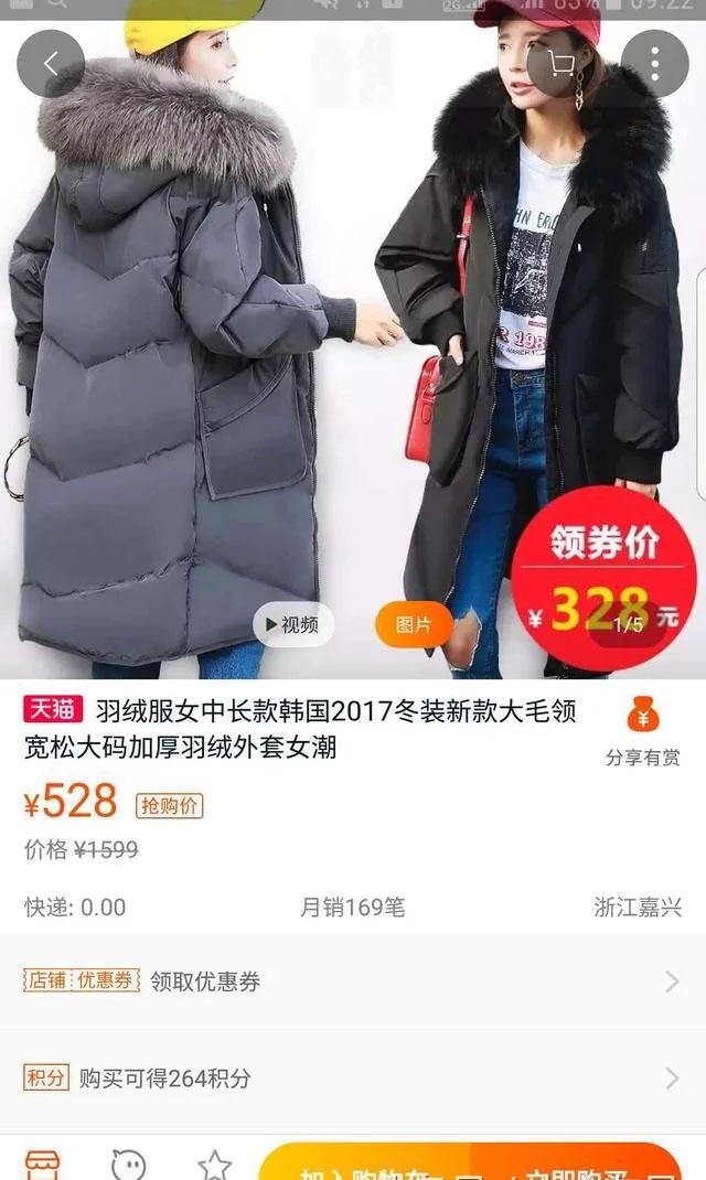 第一步:我在淘宝选了一件羽绒服,点击宝贝标题右边的“分享”按钮。