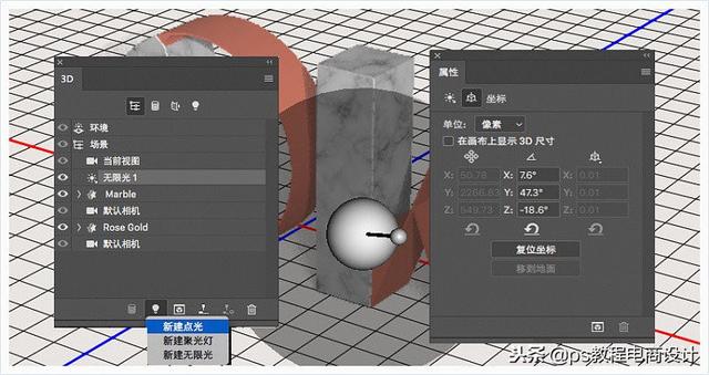 单击3D面板底部的“向场景添加新光源”图标,然后选择“新点光源”。