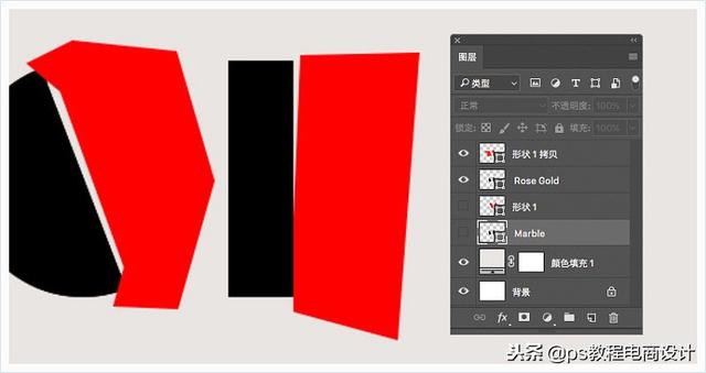 复制Shape 1图层,将Shape 1图层放在Maeble图层上面,将复制图层放在玫瑰金图层上面。