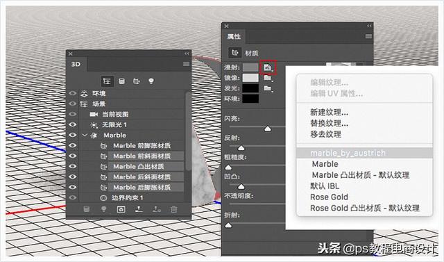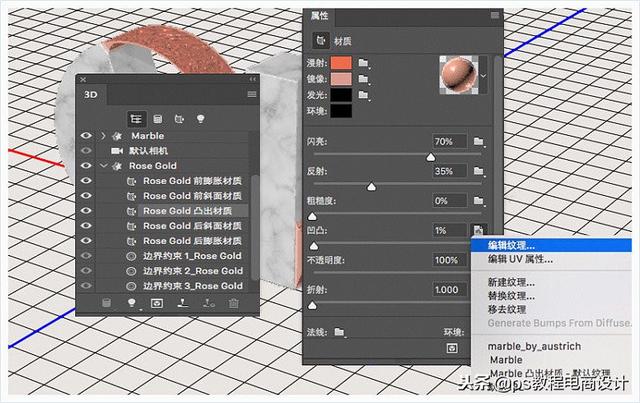 在3D面板中选择“大理石”和“玫瑰金”选项卡,并将属性面板中的“突出深度”更改为50像素。