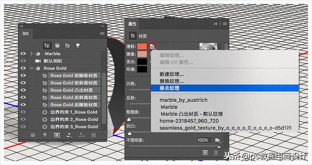 选择所有玫瑰金材质选项卡,单击“漫反射纹理”图标,然后选择“移除纹理”。