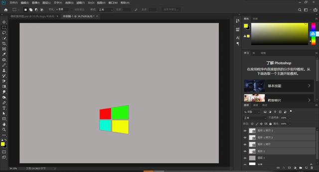 3)在英文中,按V键切换到移动工具,同时按住CTRL +shift +alt键和鼠标左键复制另外三个方块,依次用绿色、黄色和青色填充: