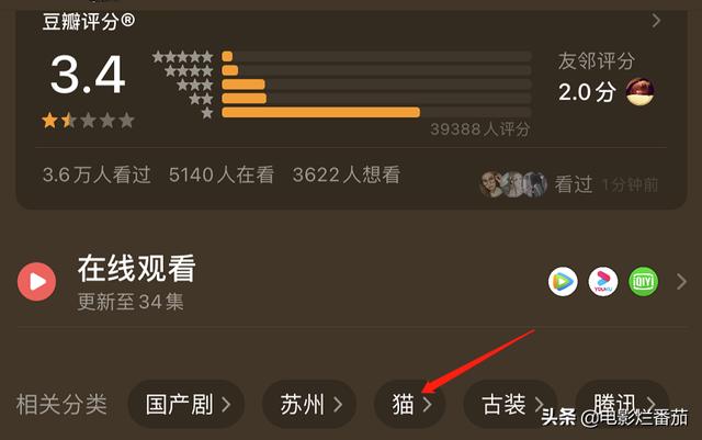 很多不明真相的吃瓜群众认为电视剧质量太低,导致评分锐减,直到大家在这部古装剧里看到一个奇怪的标签——猫。