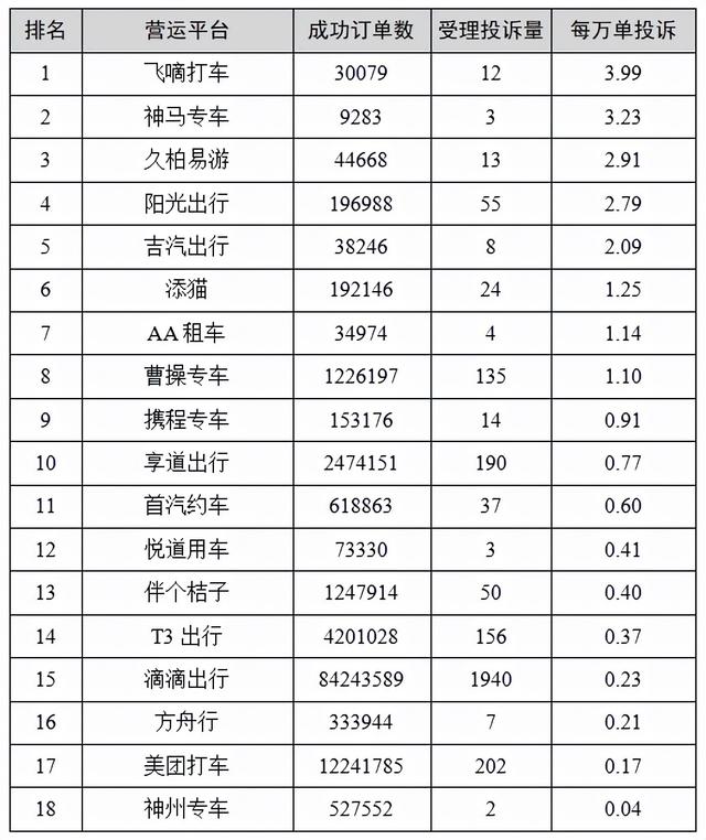 从榜单来看,用户投诉率是上海和杭州此次测评的共同依据。其中,上海市交通委发布的网约车满意度数据,是根据平台接单成功数和接到投诉数得出“每万单投诉数”,作为平台排名的主要标准。结果显示,2021年第四季度,上海网约车平台平均每万单投诉量为0.26,神州专车平台为0.04,美团打车平台为0.17,为18家平台中最低的两家。