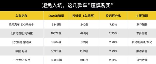 汽车市场“解冻”的背后,与汽车相关的消费者投诉屡见不鲜。除了变速箱故障、车身异响、机油增多等老套问题,智能芯片、续航里程虚高、车辆互联故障等新问题往往随后而来。今天,我们来盘点一下。2021年,哪些车型销量多,投诉少,哪些车型市场销量不尽如人意,但投诉清单却“赫然在列”。
