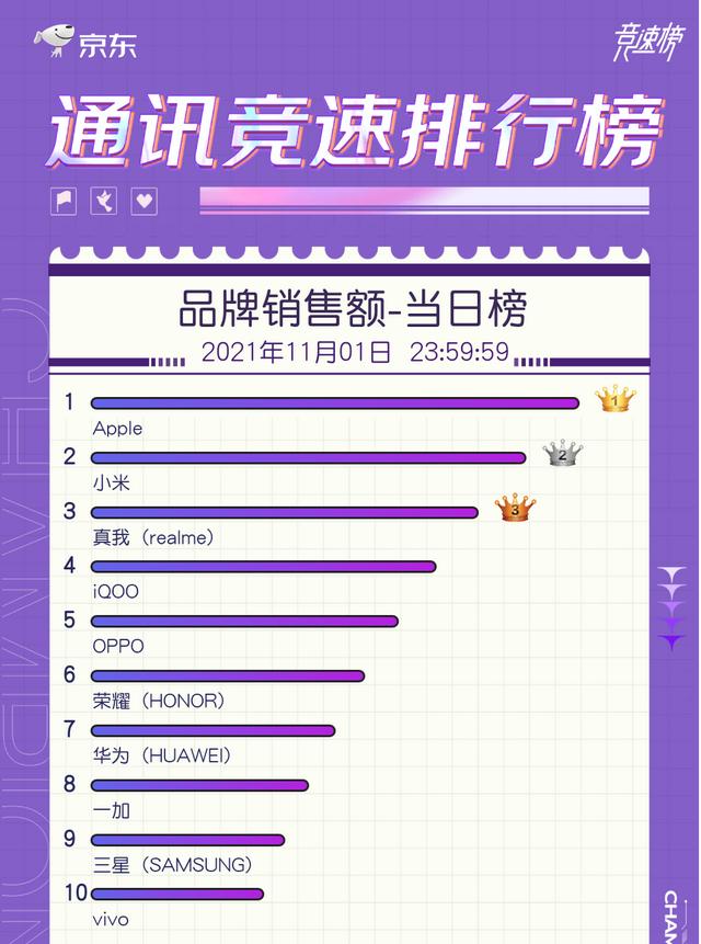 11月2日,JD.COM官方公布双11首日手机销量,统计时间为10月31日晚8点至11月1日晚24点。榜单数据显示,排名前三的品牌分别是小米、realme和苹果。单品销量榜,iPhone 13居然无缘前五。