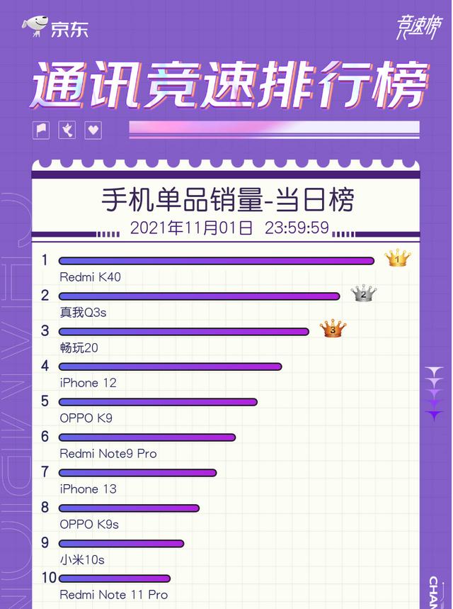 根据JD.COM赛车榜,红米K40位居手机单品销量榜第一,Real Me Q3s、畅玩20、iPhone 12、OPPO K9分别紧随其后。iPhone 13被挤到了第七位,销量甚至还不如上一代iPhone 12。