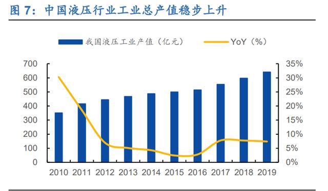 2019年,国内实现产值641亿元,同比增长7.4%。【/S2/】2019年,我国液压(含液压)行业工业产值达到668亿元,同比增长7.6%,其中最近三年液压产值占比96%。由此计算,2019年液压行业产值达到641亿元,同比增长7.4%。