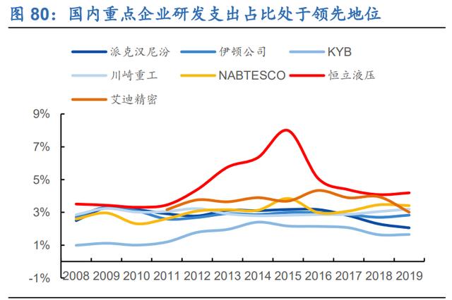国内重点企业研发支出快速增长,为企业增长增添了长期动力。近年来,国内重点企业恒力液压和爱迪精密的研发支出快速增长。2019年,恒力液压和爱迪精密R&D分公司分别继续保持41%和33.2%的高增长。由于R&D国内企业的大力投资,其研发支出占总营业收入的比重高于国际巨头公司,处于领先地位。液压元件是高技术壁垒的产品,持续而有力的R&D投资将为国内企业的增长增添长期动力。