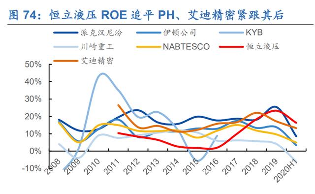 国内重点企业盈利能力快速提升,超过国际领先企业。国内重点企业爱迪精密的毛利率自2016年以来一直呈上升趋势,整体保持在40%左右的高位,大大超过国际巨头企业中排名第一的伊顿公司。2020年上半年毛利率达到43.3%,并保持稳定。国内另一家重点企业恒力液压的毛利率紧随其后,在2020年上半年快速上升,达到41.9%。相比2019年底5.3pct的增幅,两家公司的毛利率均超过国际巨头。ROE,爱迪精密一直处于领先地位,恒力液压波动较大。2016年后,恒力液压的净资产收益率持续上升,爱迪精密紧随其后。在2020年上半年液压公司ROE大幅下滑的情况下,恒力液压和爱迪精密的ROE受损相对较小,也超过了ROE水平最高的国际巨头派克汉尼汾。